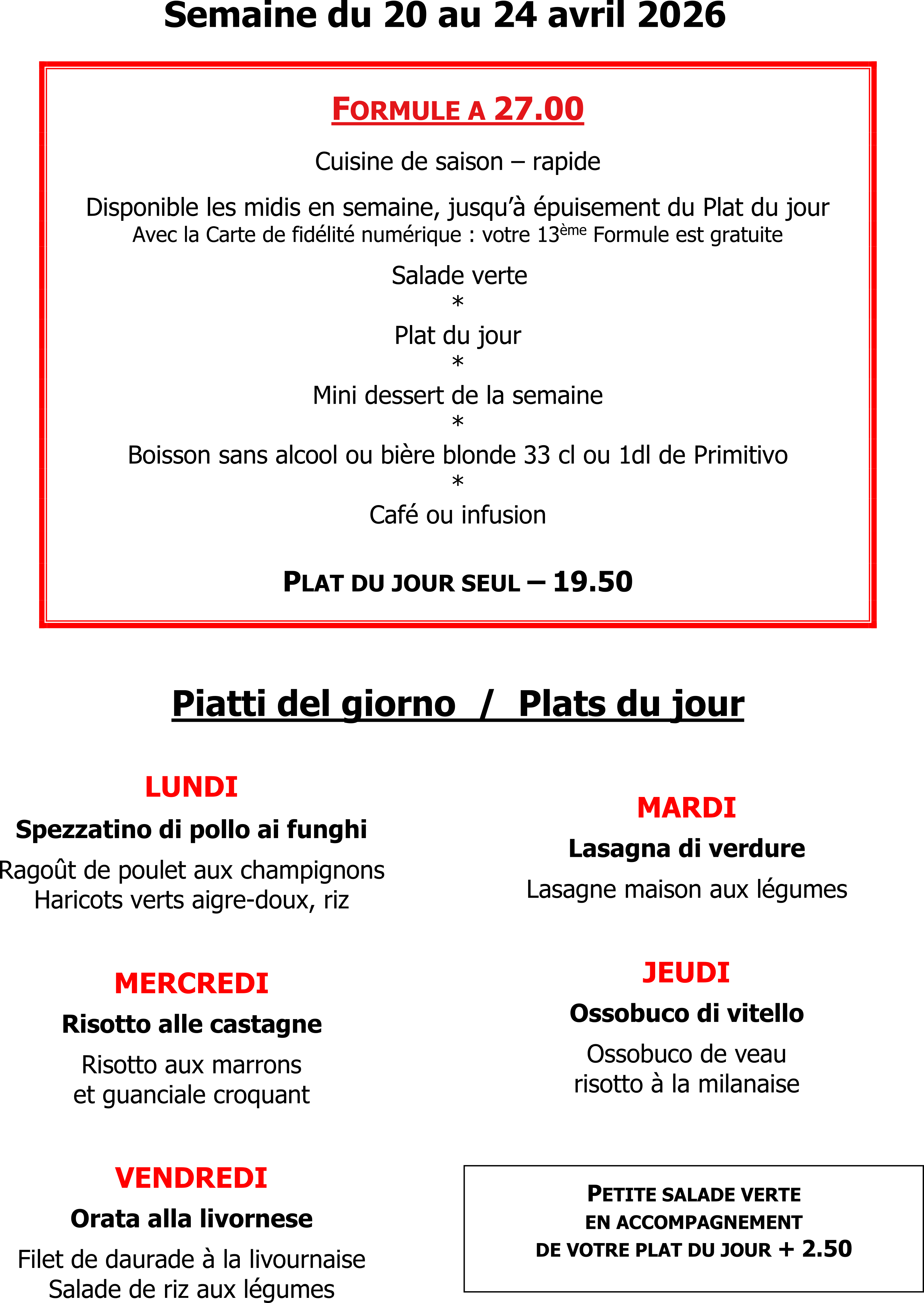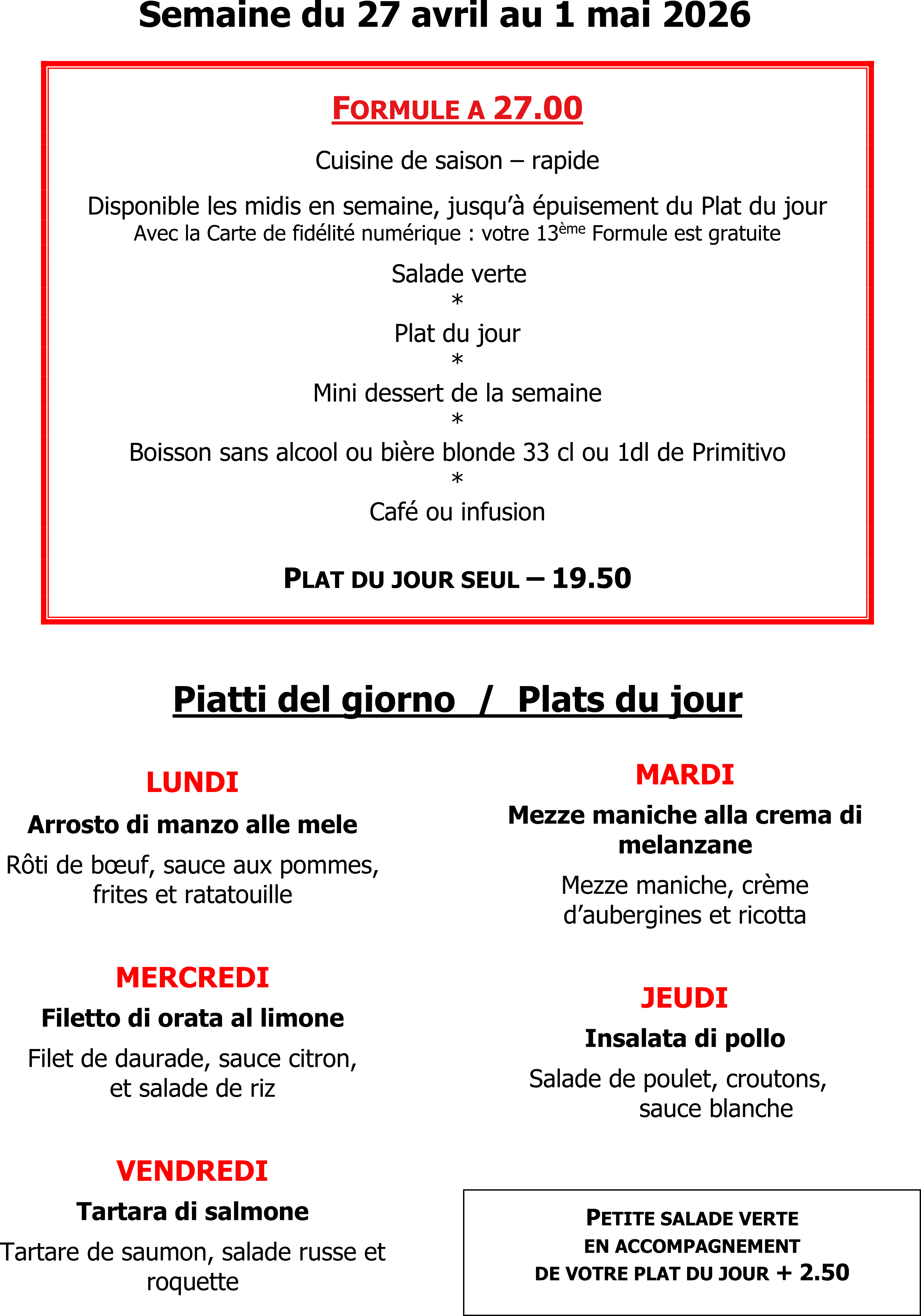Nos mets peuvent contenir des traces de produits allergènes. Pour toute question à ce sujet, veuillez vous réferer à notre menu sur code QR.